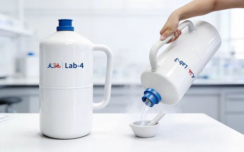 天驰Lab-3与Lab-4是专为此场景设计的侧把手液氮罐,核心使命就是通过侧把手倾倒设计,让实验人员在研磨操作中能够安全、精准、可控地为样品提供-196℃的瞬时低温环境。